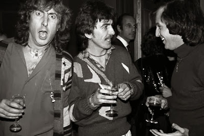 Eric Idle, George Harrison & Stuart Lerner, 1980 - "This was taken at a New Years Eve party at Ray Coopers house in Chiswick, and shows Eric and George clowning around as they often did. The third man was Stuart Lerner who was dating my friend Shelley Duvall. George and Eric broke in to an impromptu version of Guantanamara, but delicacy forbids me from revealing their version. Stuart was a therapist which was just as well, considering the company he was keeping that night." Photo: Carinthia West