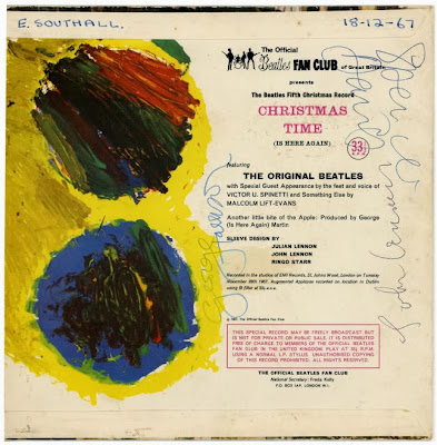 When we were at the private screening, we were given this Christmas flimsy record which was sent to Fan Club members. I can't even recall playing the record, it is excellent condition and on the sleeve it has the signatures of George Harrison, John Lennon and Spencer Davis'.